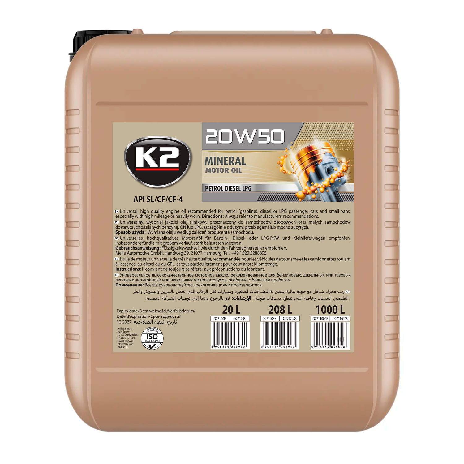 K2 TEXAR 20W-50 XL 20L — це сучасна моторна олива на основі технології NANOTECH. У ній використовуються нанорозмірні частинки олив, які точно досягають критичних точок змащення, інтегруються з поверхнею металу, забезпечуючи ідеальне змащування та захист поверхні. Спеціальні молекули протизносних присадок ідеально захищають двигун від зносу. Правильно складені мийно-диспергуючі, в'язкісно-температурні, антиокислювальні та антикорозійні інгредієнти забезпечують належні параметри роботи двигуна в будь-яких умовах.