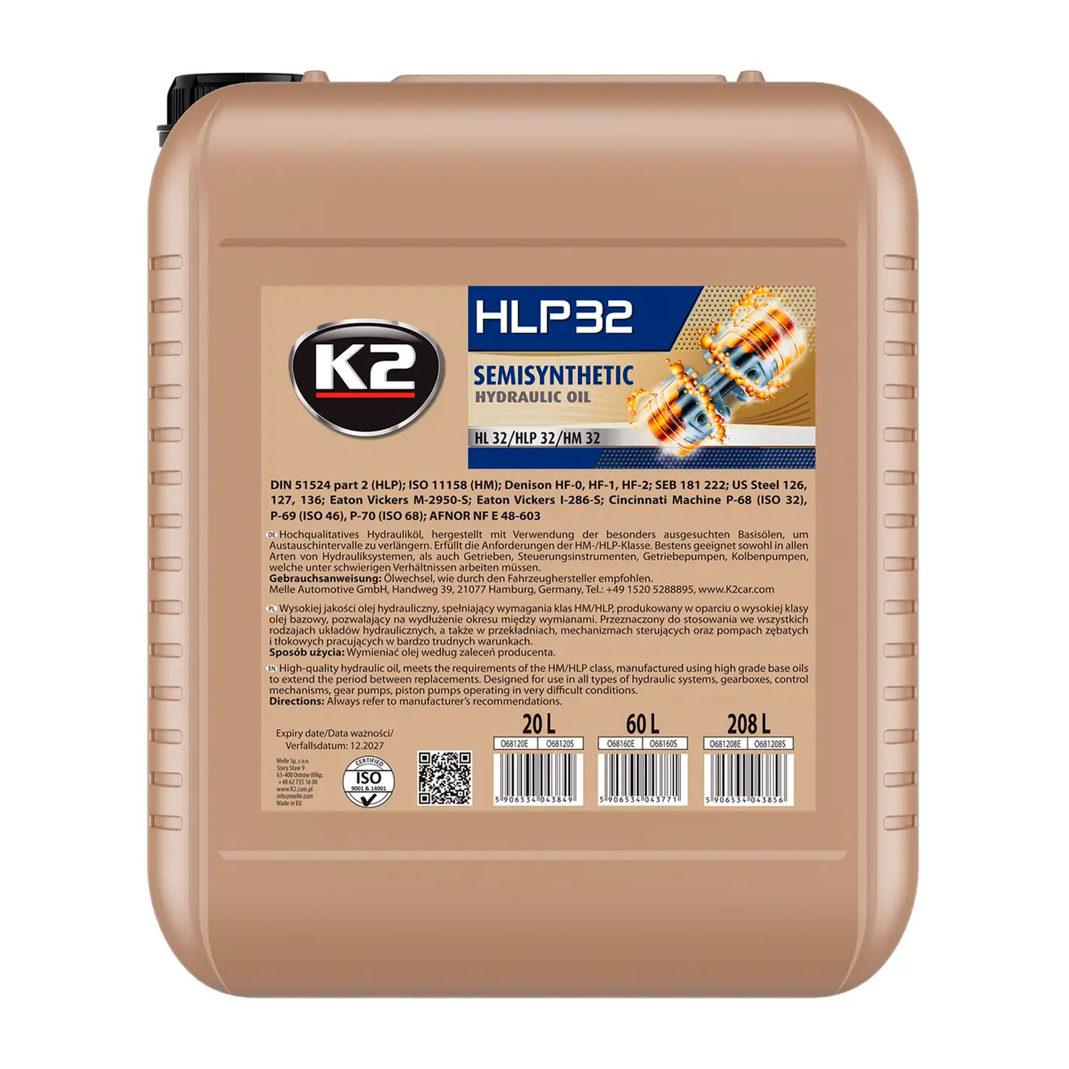 K2 HLP 32 — високоякісна напівсентетична гідравлічна олива, виготовлена на основі високоякісної базової оливи для збільшення інтервалів заміни оливи. Підходить для використання в усіх типах гідравлічних систем, коробок передач і насосів, що працюють у важких умовах.