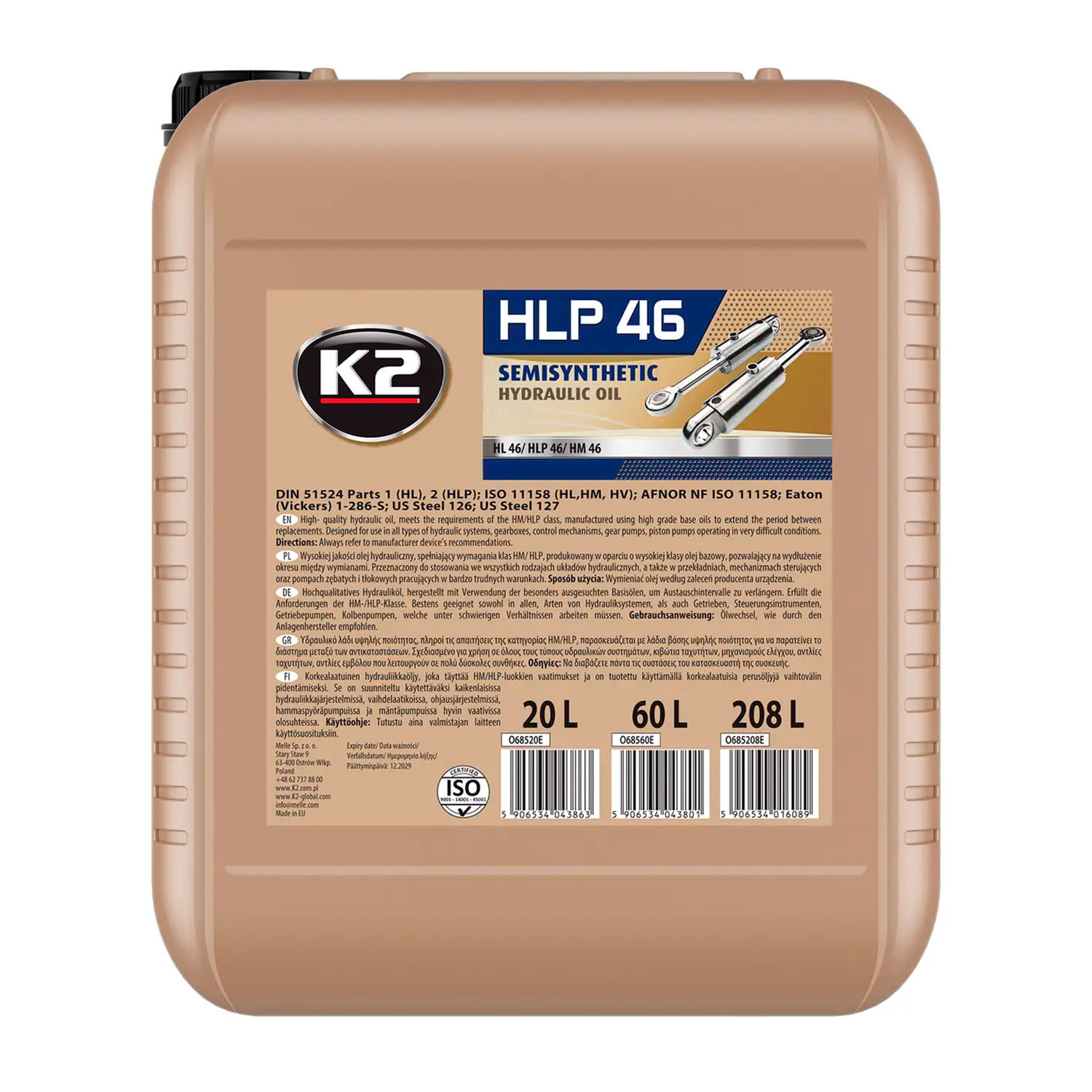 K2 HLP 46 — напівсентетична олива, що використовується в помірно гідростатично навантажених системах стаціонарного обладнання. Також використовується в приміщеннях з низькою зміною температури навколишнього середовища і в системах гідравлічного приводу та управління. Олива містить малозольні або беззольні присадки з антикорозійними, антиоксидантними, змащувальними, деемульгуючими та антикальцевими властивостями. Характеризується високими антикальцевими властивостямиЮ хорошим відділенням повітря, гідролітичною стабільністю, а також високою здатністю до фільтрації. Змащувальні властивості гідравлічної оливи захищають частини гідравлічних систем на тривалий час. Олива широко використовується у всіх типах гідравлічних і циркуляційних систем. Застосовується в сільському господарстві для машин і тракторів, де використовуються гідравлічні системи, а також в будівельних машинах, наприклад екскаватори або навантажувачі.